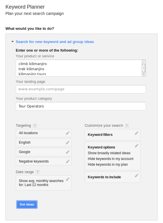 The first step is to brainstorm a list of around 20 keywords that you think are likely to be searched for and that relate to the tours you offer. There's no point wasting resources to rank well for a search term that doesn't relate to a search a potential customer would make. Just to clarify when I talk about 'keywords' a keyword is often a short phrase that someone is likely to search for, e.g. 'climb Kilimanjaro' is considered a single keyword.
